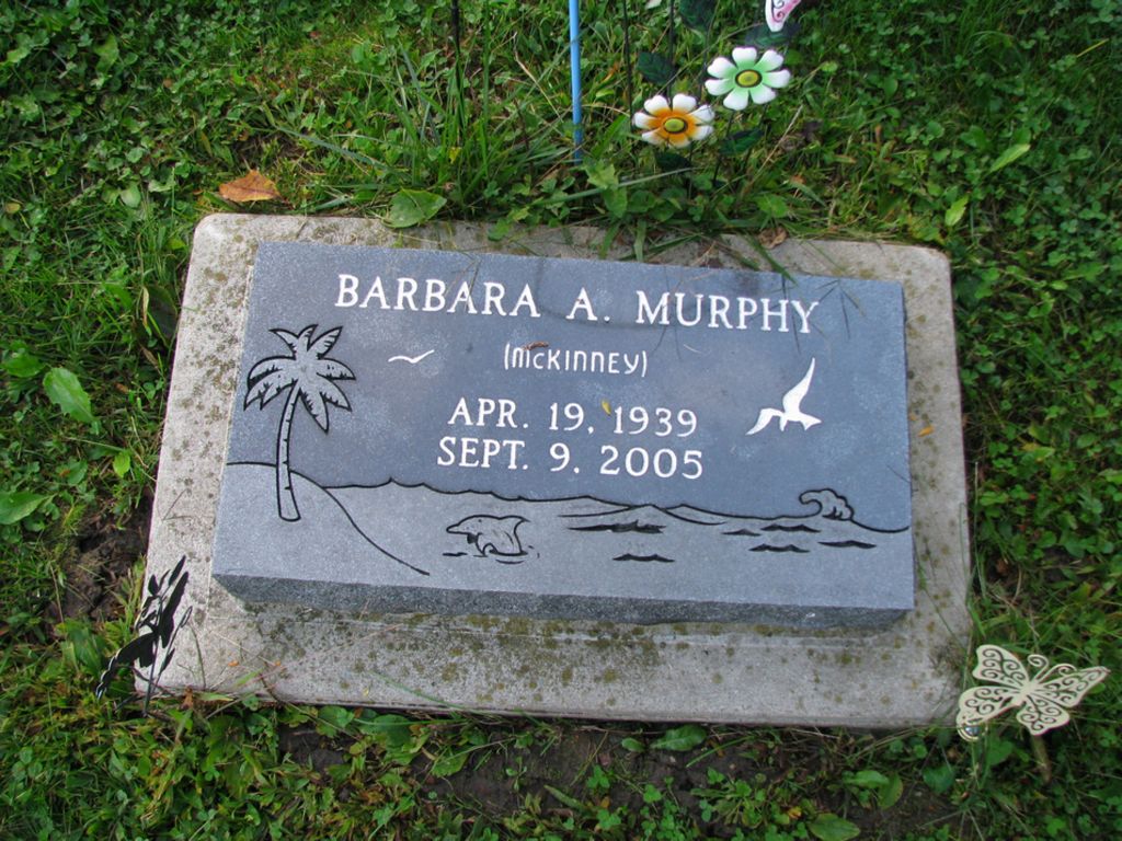 Find a Grave - Headstone Inscription: Barbara A. Murphy (McKinney) Apr. 19, 1939 Sept. 9, 2005 Grave Location: South side of cemetery, 7th row east of Water St., next to drive Note: Unknown how she fits into the Murphy/Murphey Family (Aug 2017) |