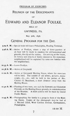 | "It was directed that all living descendants of Edward and Eleanor Foulke, and those whom such persons had married, should be invited by card to the Reunion. Those invited became 'ipso facto' members of the Association." [1] |