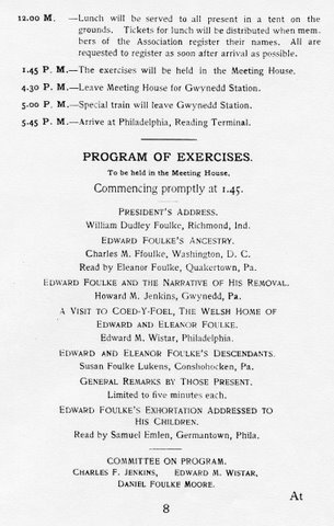 | A meeting was called by Howard M Jenkins in Philadelphia on 7 Jan 1898. A proposal to hold a reunion was made at this meeting and on the next meeting of 28 Jan 1898 the Association of Descendants of Edward and Eleanor Foulke was formed. The Chairman of the Association was Howard M Jenkins and he named William Dudley Foulke [ID2689] as President, Edward M Wistar, Treasurer and Frank Foulke as Secretary |