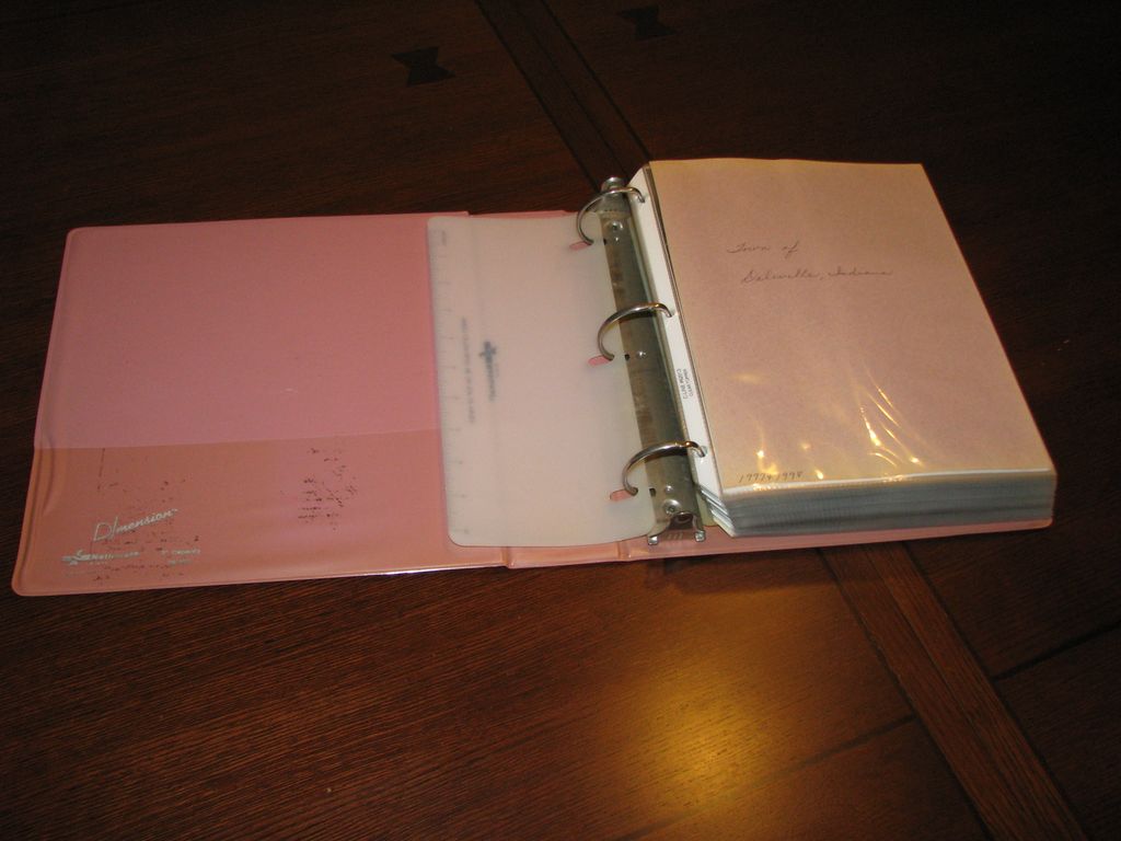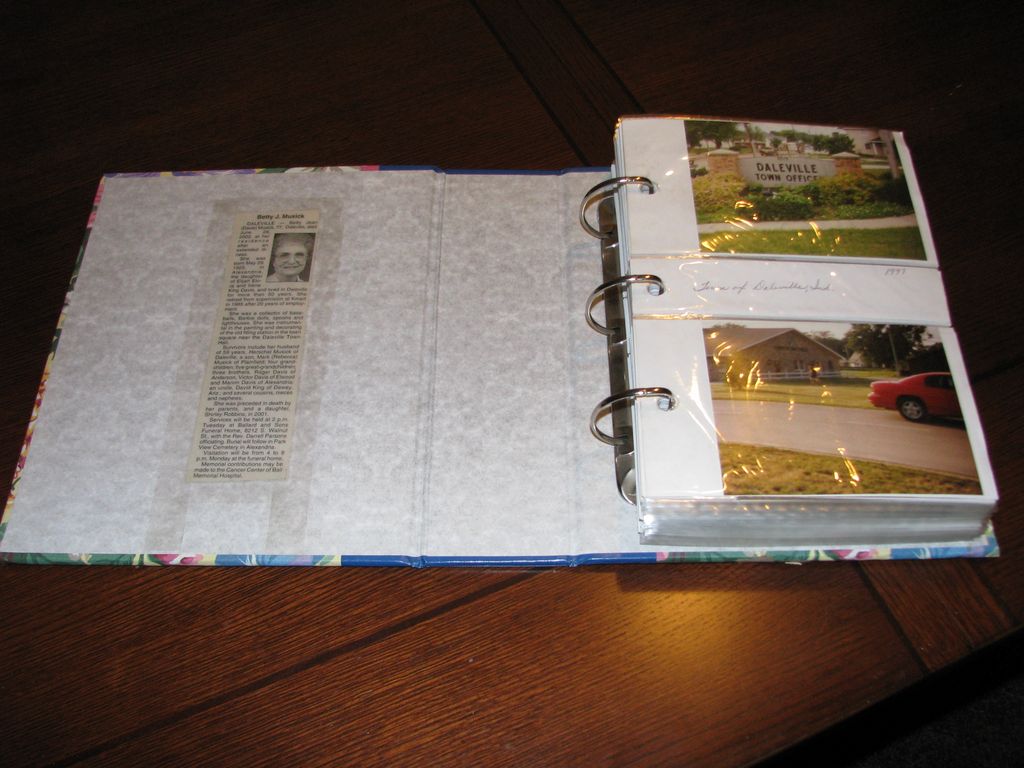 (Acc003218) - - Original Scrapbook and opened to first page - RobbHaas Web Page - - This Scrapbook contains 104 3-ring plastic sleeve pages, open at the top, which contain Newspaper Articles (original & Photocopies), Photos, Original Receipts and Documents relating to the Town of Daleville and it's history. Repository, Original Material: Daleville Community Library, Daleville, Indiana |