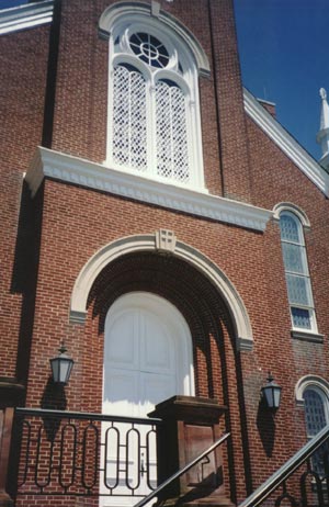 also attended to. The inscription on the stone was in German and is as follows: 'All, die hier gesen aus und ein, Sollen Gott und dem Koenig unterthan sein,' - In English translation would read as follows: 'All who here go in and out Should be subject ot God and the King.' This couplet indicated their loyalty to England. But during the Revolution their sentiments had been changed, and the inscription became an eyesore. The work "king" was at the direction of the Building Committee, erased with chisel and hammer by Jonathan See, a son of the master carpenter. It was then repainted - the letters in black and the stone white." [S3, page 167] |