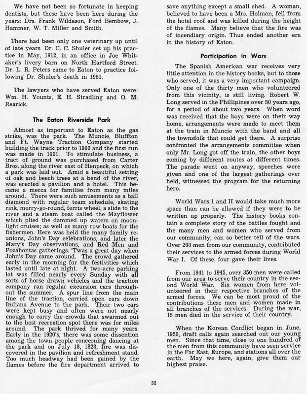 - Images Cemeteries Delaware County, Indiana Eaton Centennial Book, 1954 Eaton Photo Album Photos POW Camp Railroads Riverside Park Eaton School |