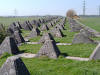 | "In other places, the German engineers had constructed chains of "dragon's teeth," curious objects that looked like canted headstones in a strange cemetery. In some cases the dragon's teeth were no more than heavy posts or steel beams embedded in the ground, but usually they were pyramid-shaped reinforced concrete projections. There were five rows of projections, poured monolithic with a concrete foundation and increasing in height from two and a half feet in front to almost five feet in rear. The concrete foundation, which extended two and a half feet above the ground on the approach side, formed an additional obstacle." [S5, p 34] |