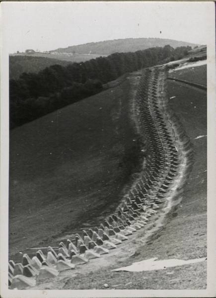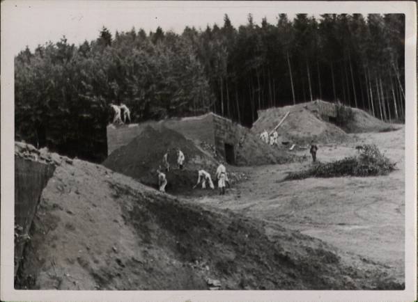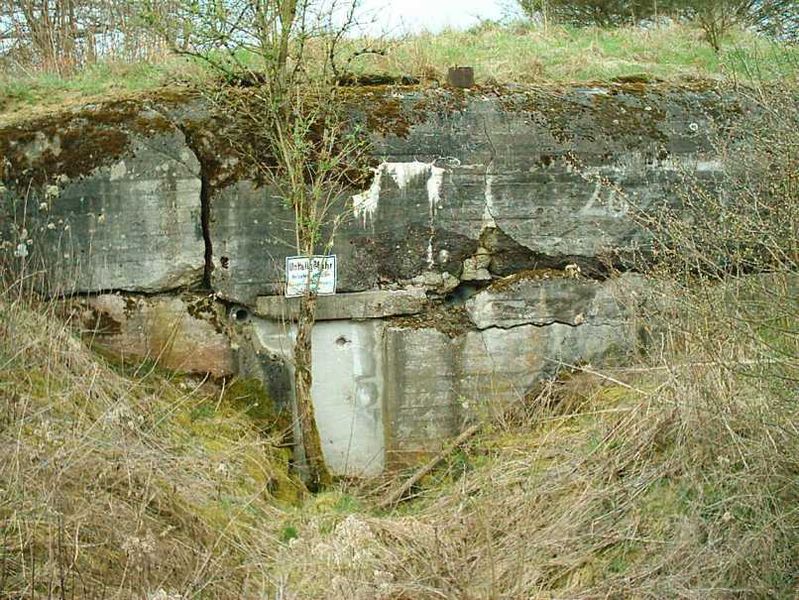 | The west wall construction first began in 1936 but the effort intensified in May 1938. Dr Fritz Todt, an engineer, was in charge of the construction of this line. It was a system of many small pillboxes. By late September 1938 over 500,000 men were working on the project. Almost 1/3 of Germany's total concrete production went into the project. On this line over 3,000 concrete pillboxes, bunkers and observation posts were constructed. Most construction work on the wall halted after Germany's victory in France and was not resumed again until September 1944 when Hitler made an effort to strengthen the line. [S5, p 31] |