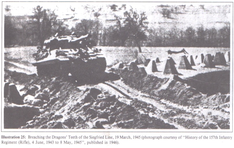 | "In other places, the German engineers had constructed chains of "dragon's teeth," curious objects that looked like canted headstones in a strange cemetery. In some cases the dragon's teeth were no more than heavy posts or steel beams embedded in the ground, but usually they were pyramid-shaped reinforced concrete projections. There were five rows of projections, poured monolithic with a concrete foundation and increasing in height from two and a half feet in front to almost five feet in rear. The concrete foundation, which extended two and a half feet above the ground on the approach side, formed an additional obstacle." [S5, p 34] |