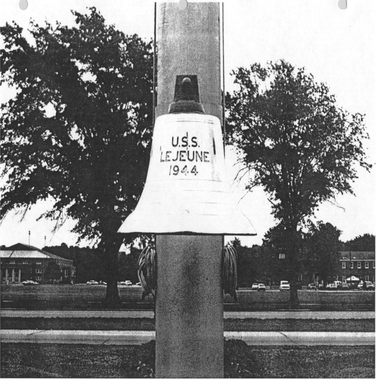 S3, I3, - 280 pound brass bell S3, - Every morning at 0800, eight bells is struck on the bell S3, - "USS LeJeune 1944" is the inscription on the bell S3, - "Camp LeJeune's morning bell was the first bell of the German warship Windhuk; the bell was aboard the ship when it became the USS LeJeune." S3, I3, |