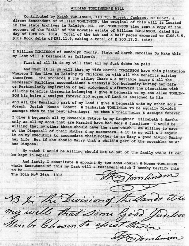 | S8 | Will for William Tomlinson, dated 26 Oct 1812, Randolph County, North Carolina. Original Will in North Carolina State Archives, Raleigh, North Carolina. Acc000792/ Doc1831.pdf |